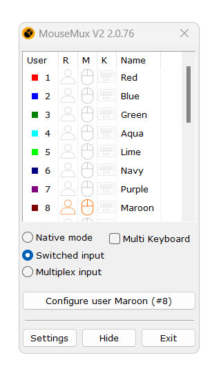 The icon in the R column will light up orange if that user is the active (root) user in Switched mode. And will turn to red if another user is denied becoming root (when the root user has a button down).